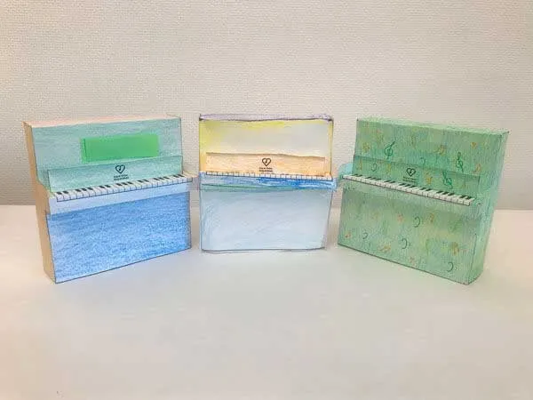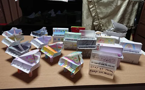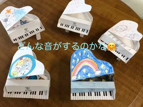 みんなで作ってくださりありがとうございます!これはピアノ大博覧会ですね。シックな黒ピアノもあれば、パステルカラーのおしゃれなもの、材質も段ボールやトレーシングペーパーなど、多彩ですね。 (スタッフ・シロクマより)