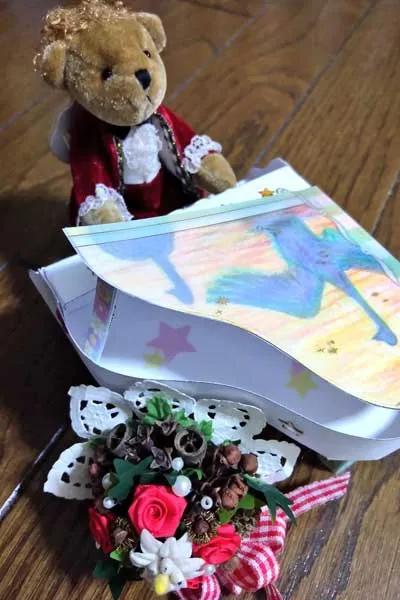 ふたに大きなハートが5つ・・と思いきや、小さなハートで埋め尽くされていてびっくり!職人の域です。中にもカラフルなピアノ線が!どんな音がするんだろう♪とても楽しく作ってくれたのが伝わってきます♪ (スタッフ・トラより)
