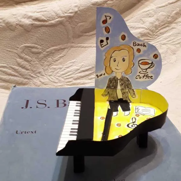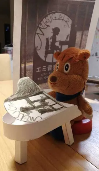 ピティナのバッハさんがグランドピアノに!驚き・かわいいアイデアです!コーヒーが大好きなバッハさん、このピアノを奏でると、素敵な香りがしそうですね。(スタッフ・レッサーパンダより)