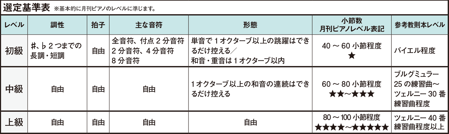 課題曲一覧より1曲を選択し、ピアノ・ソロに編曲 レベルは初級、中級、上級の3 段階