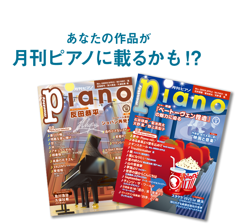 また、出版作品の版権は出版社に帰属いたします(無断転載・流用を禁じます)月刊ピアノでの掲載にあたり、サイズを調整させていただく可能性がございます。