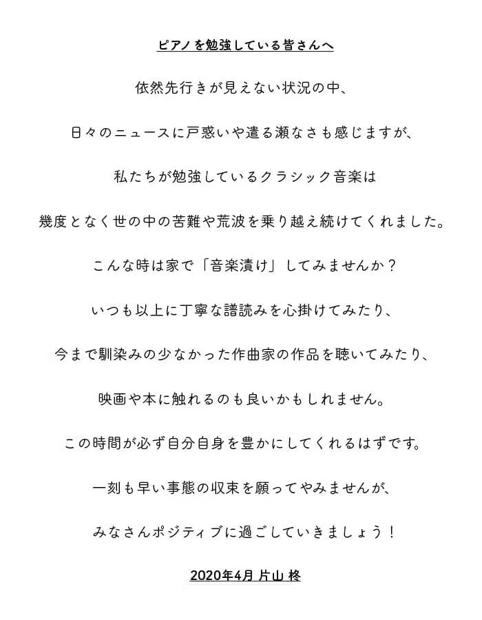 Stay at Home, Keep on Musicの趣旨にご賛同いただいたピティナ・特級グランプリの皆様から、ピアノを演奏している皆様へ向けて、メッセージをいただきました。特級ファイナルの演奏も、おうちの音楽時間にお楽しみください