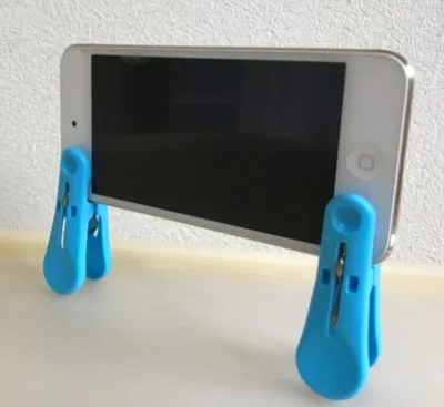 洗濯ばさみ2つを使って挟むとスマホスタンドになりますよ!(丸山絢子先生/茨城)