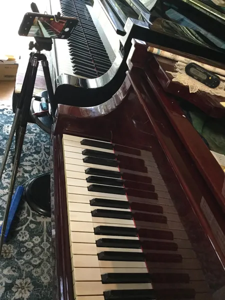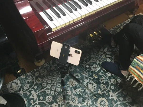 - カメラの三脚にスマホをセット出来るものを使用しています。角度や高さを自由自在に調節出来るので鍵盤も良く映すことができます。