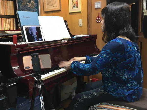 しかし、マイナス面を気にしてはレッスンになりませんから、対面で気付き難い面を探りだして生かした方法をとっています。 例えば私は、対面レッスンでは常に右側の楽器に座っているので、どうしても左手への指摘が少なくなりがちな事もあります。オンラインではそちらもよく見る事が出来ますから、見逃さず色々な角度からアドバイスできます。このことは、指導にプラスに働いているかと思っています。音の出し方、手の形、手首の使い方や動き、肘の動かし方、指の運び方ひとつにしても出てくる音色までが変わりますから。