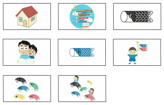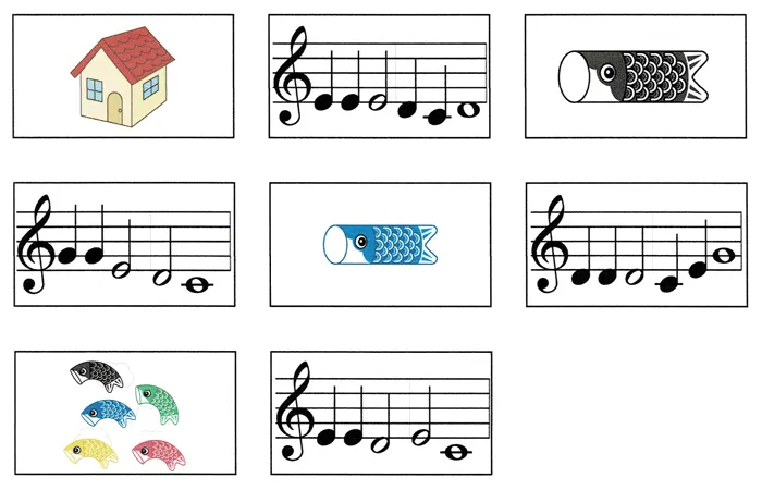 2小節ごとに1枚のスライドを提示しながら歌います。1回目はすべてイラストです。(「こいのぼり」の歌唱の例)