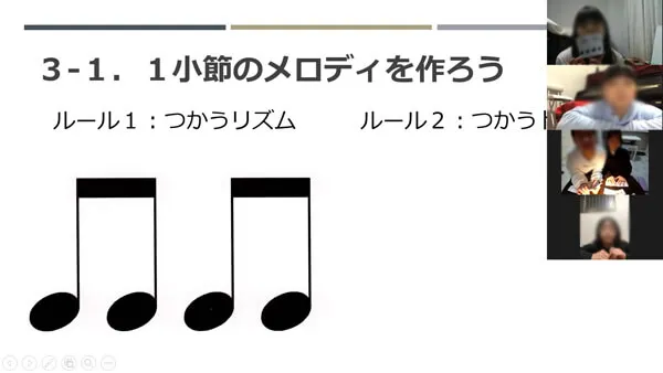 パワーポイントと五線のPDFを用意し、前半30分、後半30分で行いました。