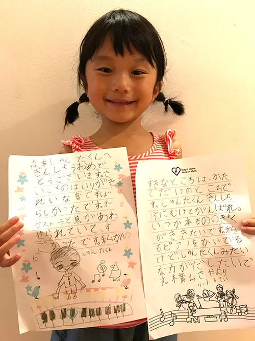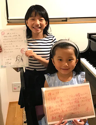 ファイナリストの方々から本当にお返事が届いた時には、心優も咲弥も飛び上がって喜びました。咲弥は憧れの森本隼太さんからの手紙にハイテンション!!「いつか咲弥さんの前で演奏したいです!」という一文に、本当に森本さんの演奏を生で聴きたいという想いがさらに強くなりました。そして、「一緒にピアノを楽しんでいこうね」と声をかけてもらったことで、ピアノを弾く喜びがさらに大きくなりました。山縣美季さんの似顔絵を添えてお手紙を書いた心優には、山縣さんもかわいいイラスト入りのお返事を送ってくださり、「絵も上手やぁ!」と目をキラキラさせて感動していました。