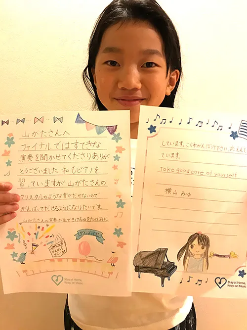 2人とも、ピアノの横に手紙を並べて練習に励んでいます。日々の練習にも、一緒に頑張っているような錯覚で、奮起して取り組んでいます。特級ファイナルの方なんて雲の上のまた雲の上の存在ですが、そのような方からお手紙をいただき、すごく刺激になりました。秋にはまたオンラインステップへの参加をと意気込んでいます。例年とは違う形でしたが、精一杯、音楽やピアノに向き合うことができました