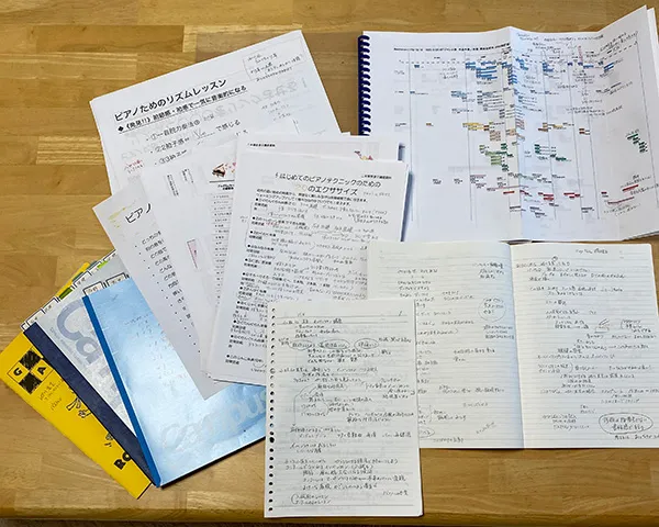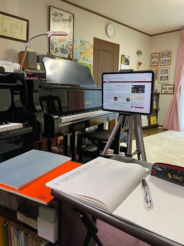 オンラインセミナーのメリットは、まず、会場まで足を運ぶ時間と交通費がかからないことです。また、机の上に楽譜や資料を沢山広げて、受講しながらすぐに見られることも、とても便利です。さらに、マイクをミュートにするので、お話の内容を家のピアノで実際に音を出して確認できることも、自宅でのオンラインならではのことです。