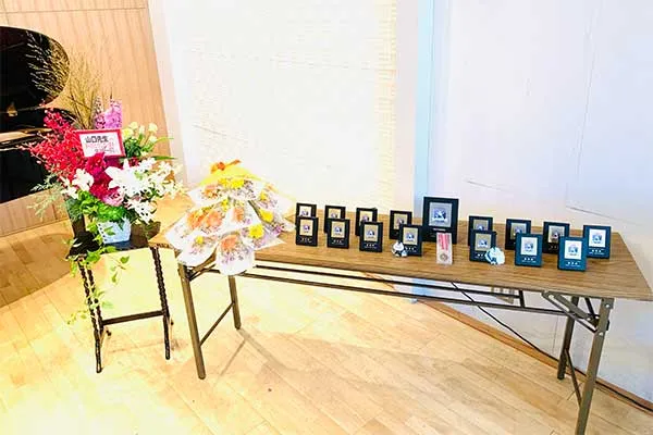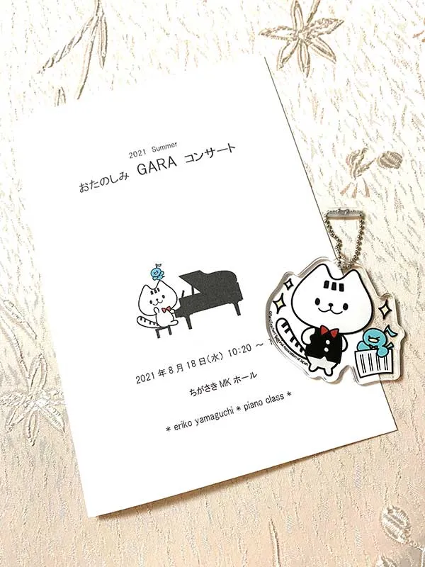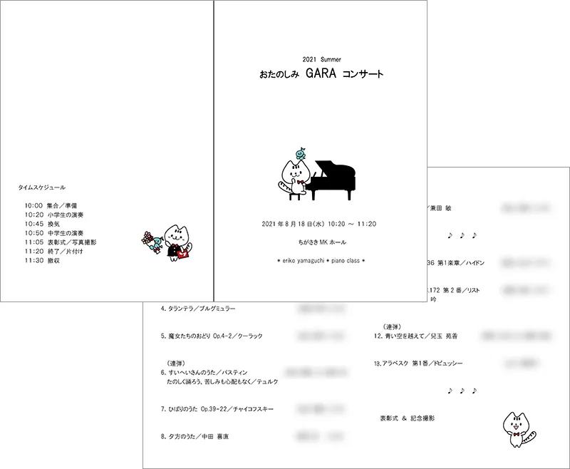 感染対策のため、生徒たちだけでの40分間のミニコンサート形式になりましたが、会場にはお花とともに、この夏の努力の結晶の賞状や盾、メダルを飾りました。生徒たちにも人気の可愛いぴてぃにゃんのイラストをピティナのホームページの「ぴてぃにゃん素材集」からダウンロードして、プログラムに使わせていただいたことも、楽しいお祝いの会を演出するのに重宝しました。