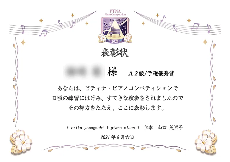 そこへ、ピティナのホームページで「レッスン室で表彰式」という、素敵な賞状のテンプレートをご提供くださる記事を発見しました。これを使わせて頂いて、教室内で全員入賞のお祝いとしてガラコンサートを開き、改めて表彰をしよう!と思い立ちました。