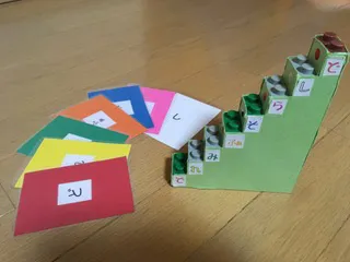 川村先生自作の「音の階段」ブロックに色画用紙で飾り付けしています。