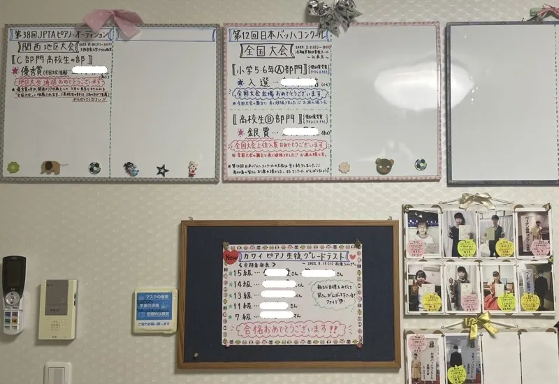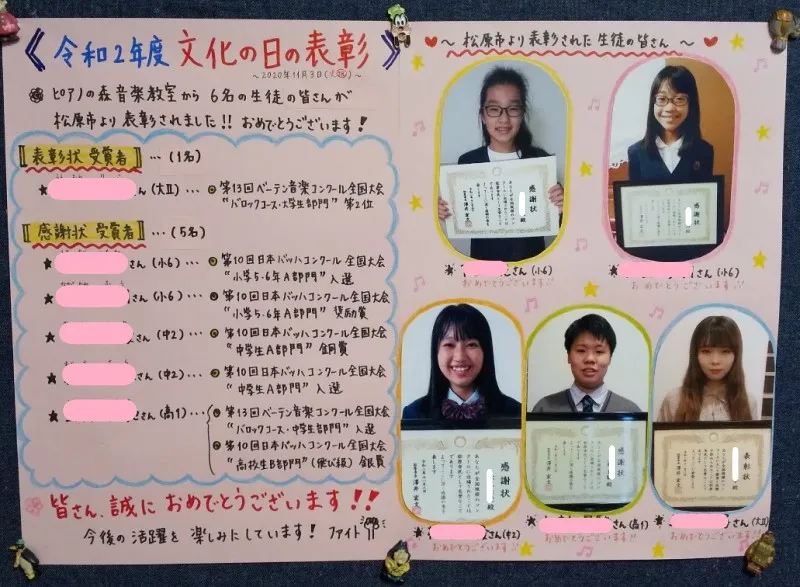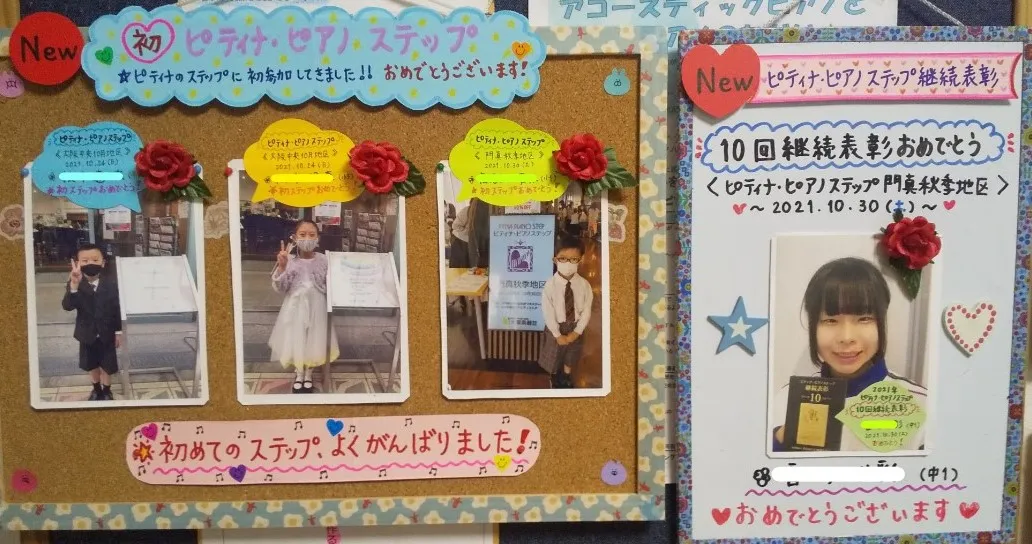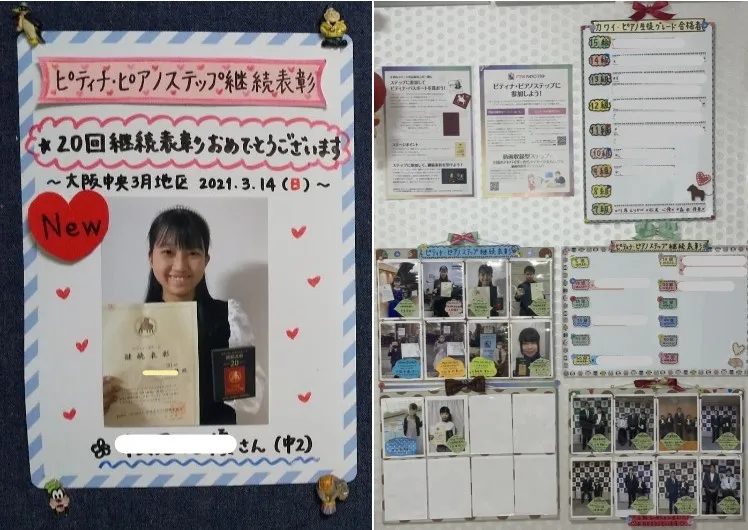 生徒さんのがんばりを掲示することで、本人の自信や励みにもなるし、それを見た他の子や年下の子たちも、キラキラした目で写真を見ながら、「私もやってみたい」「今度はこれに挑戦してみたい」「コンクールで全国大会に行ってみたい」「ピアノがうまくなってこんなかっこいいお兄さん・お姉さんになりたい」と、具体的なイメージとともにワクワクした気持ちで目標を持つきっかけになっていると思います。