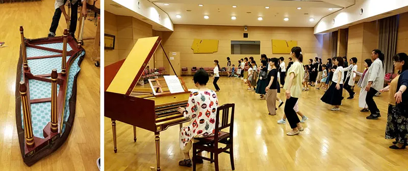 参加者は小学生の親子からピアノ指導者、音楽愛好家まで幅広い方々にご参加いただき、メヌエット、ガヴォット、ブレなど日頃ピアノで演奏している曲のステップを学んでいただきました。第3部は、小学生から大学生、ピアノ指導者を受講生とした公開レッスンの形で行いました。第3部の前には、岡山のチェンバロ工房からチェンバロを運んでくださったチェンバロ製作者の難波修さんにチェンバロの構造についてのお話をしていただきました。チェンバロを初めて生で見る子どもたちは興味津々でした。