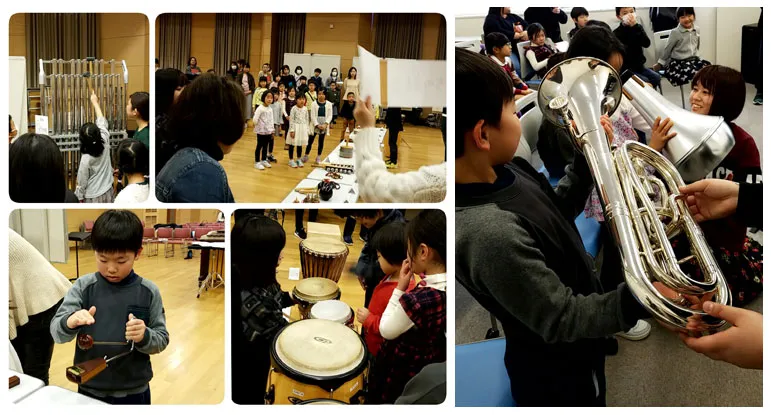 末永先生に様々な楽器についてお話をしていただいた後、広島文化学園大学学芸学部の学生さんたちが、ご自分の専門の楽器について説明をしてくださいました。広島文化学園大学のご協力もあり、「トランペットのお部屋」などたくさんのお部屋にそれぞれの楽器について探検に行く形で、子どもたちは大興奮でした。それぞれの楽器がどのような構造になっているか、どんな音色か、吹奏楽やオーケストラなどでどのような役割をするかを学びました。学生さんたちの演奏を聴かせていただいたり、実際に自分たちでも楽器を演奏させていただいたり、とても楽しい時間を過ごしました。