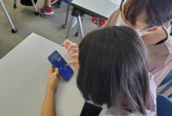 講師の笹川先生は、無料のアプリをダウンロードしたスマホやタブレットで「どんぐりころころ」のメロディとドラムを1小節ずつ作っていくという作業を、小学生でもわかるように、画面をスクリーンに映しながらゆっくりと丁寧にご指導くださいました。子どもたちは飲み込みが早く、与えられた課題以上にどんどん進めていき(笑)、メロディとドラムのみを打ち込む説明が終わるころには、なぜか他の楽器でリズムやハーモニーが何重にも打ち込まれたとても豪華な「どんぐりころころ」が出来上がっていました。