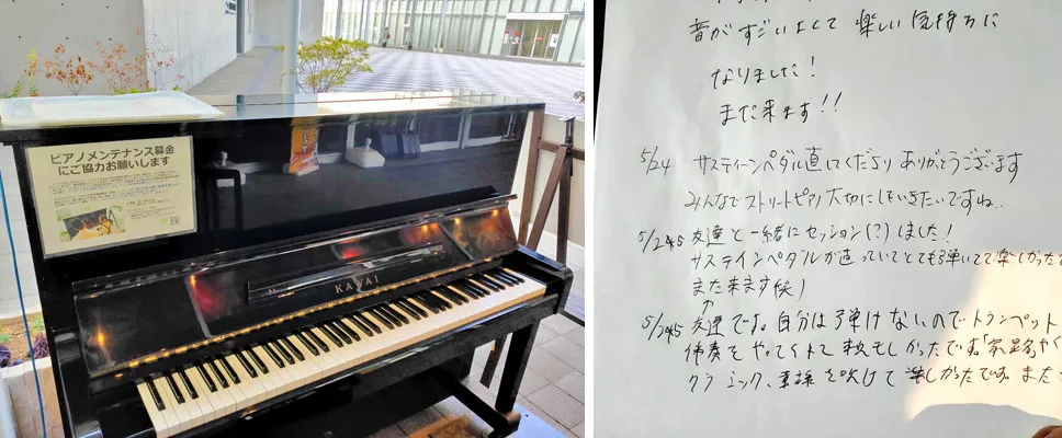 このピアノはもともと、市民の方々がよく利用する広場に地元の商店街振興組合の方が置いたのが始まりで、設置するにあたり理解を得るのが難しかったそうですが、今ではまさに市民のピアノになってきたという感じがありますね。そうした一つ一つのピアノのオーナーさんと、そのピアノを取り巻く人たちの想いとをつないでいくのも、私たちの役目だなと感じています。
