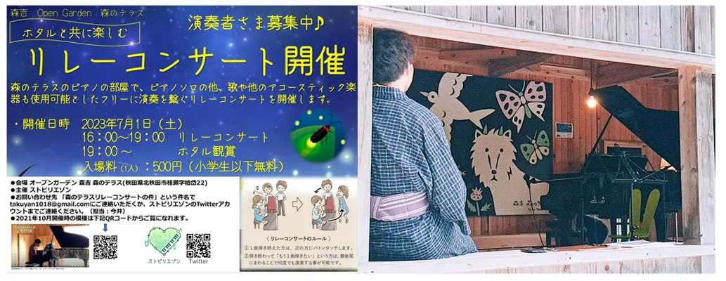 また、7月1日にはホタルが美しいことで有名な「オープンガーデン森吉 森のテラス」という自然豊かな会場のピアノを活用して、リレーコンサートをして、暗くなったらそのまま皆でホタル観賞会をするというイベントも行いました。木の建築で、川の音や風の音を感じながら演奏することができるので、過去のイベントでも人気だったのですが、今回はせっかくなので夜にやりましょうと。当日は好天に恵まれ、たくさんのホタルを鑑賞することができました。人が集まりやすいとか、自然が豊かだとか、その場所のよさを生かしたイベントが今後もできたらと思っています。