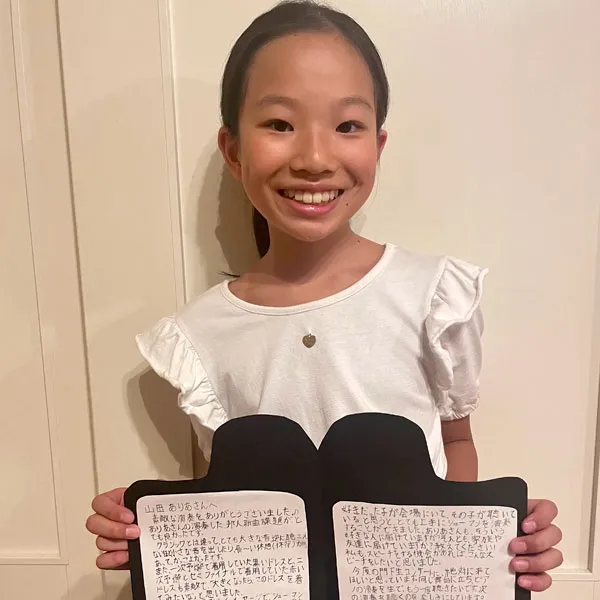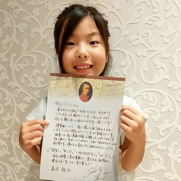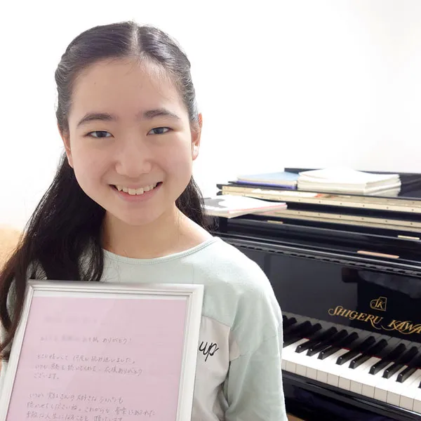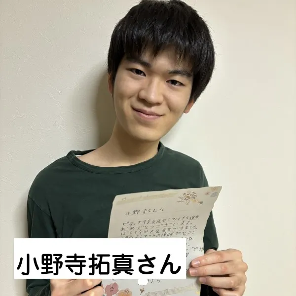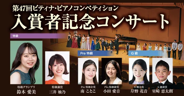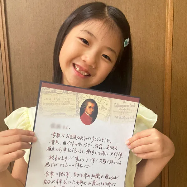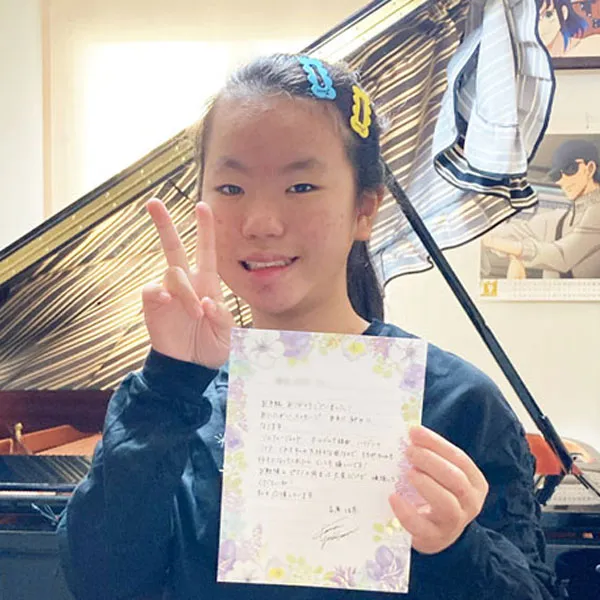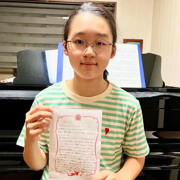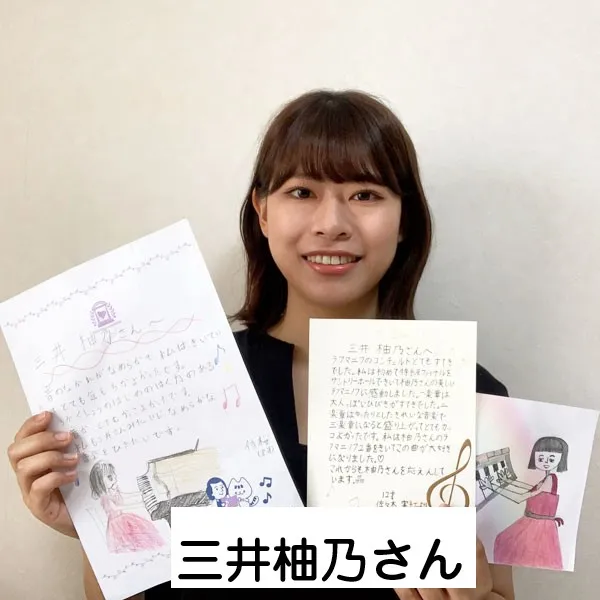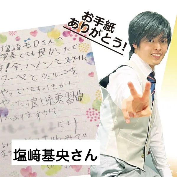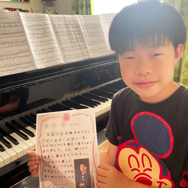 鈴木愛美さんへ 鈴みたいにコロコロした音や、小さくてやわらかい音が、とくに好きでした。やわらかいけれど、きれいにひびく音を出したいけれど、小さくひこうとすると、あまりひびかないので、どうやったらできますか?(8歳) 8さいで、やわらかいけれど きれいにひびく音を出したいと思えていることが、すごいことだと思います! ピアノだけではなくて、オーケストラなどいろいろな人のえんそうをきいて、〇ちゃんがどんな音を出したいのかイメージをふくらませることで、〇ちゃんの出したい音に近づくのではないかな、と思います。わたしも、きれいな音を出せるように、これからもがんばります!(鈴木愛美さん) 嘉屋翔太さんへ ファイナルも素敵でした。また聴かせてください。今ツェルニーとスケール、ハノンをやっています。他にやった方がいい練習曲はありますか?(8歳) また聴きたいと言ってもらえることが、何にも勝る日々の励みになります。嬉しいです! 曲集では、指の運動性能を鍛えることができる一方、指の動きに耳がついていかない、それに気付かないことが有り得ます。僕からは毎日できる細やかなトレーニングを。 《「音階を」「ゆっくりと」「一切の凹凸なしに」「レガートで」》指先の感覚と耳が連動して、音を生む快感が増すはずです。その一音を楽しんで!(嘉屋翔太さん) 三井柚乃さんへ 私は初めて特級ファイナルをサントリーホールできいて柚乃さんの美しいラフマニノフに感動しました。一楽章は大人っぽいひびきがすてきでした。二楽章はゆったりとしたきれいな音楽で、三楽章になると盛り上がってとてもカッコよかったです。私は柚乃さんのラフマニノフ2番をきいてこの曲が大好きになりました。(12歳) 温かいメッセージをいただけて、とても励みになります。ラフマニノフの2番、私も大好きな作品の一つです。〇さんの心に響く音楽をお届けできたとしたら本当に嬉しいです。勉強も大変になってくる頃だと思いますが、私も〇さんを応援しています。そして、いつかお会いできることを願っています♪(三井柚乃さん) 神原雅治さんへ はく力のあるカッコいい場面と、なめらかでやさしい場面のちがいがよく伝わってきました。どんなことをイメージして迫力のある音を出しているのですか?(8歳) お手紙ありがとう!とってもはげみになってうれしいです!! はく力のある音を出す時は、手だけでひくのではなく、うでや体の他の部分も使ってひくことを意識しています。自分なりにその曲のストーリーを考えて、この部分はどんな人がどんな場所で何をしているところなのかを想像してみるのも、イメージがつきやすいのでよくやっています!(神原雅治さん)その他にも、たくさんのお手紙をいただきました。ご参加ありがとうございました。