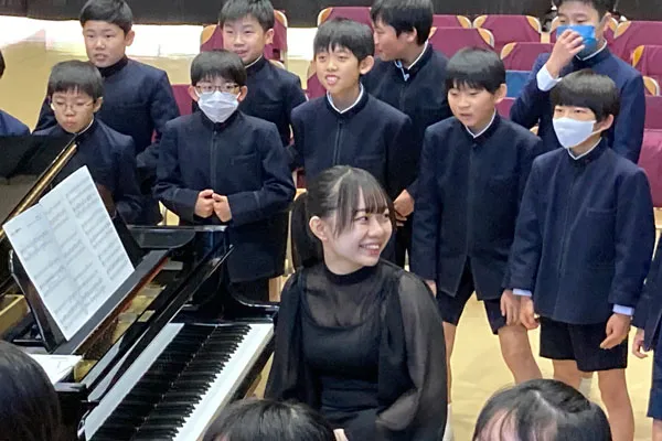 1月28日にピティナ高知支部による入賞者記念のブロッサムコンサートへゲスト出演された鈴木愛美さんが、翌日に高知学園高知小学校にて、5,6年生対象の学校クラスコンサートに初出演しました。共演は、地元で活躍するバリトン歌手・山本幸雄さん。鈴木さんの得意とするシューベルトの魅力を、ピアノソロと歌曲とで届けました。最後には、鈴木さんのピアノを囲んで子どもたちが「君をのせて」を合唱しました。休み時間にも訪れた児童との交流を深めていました。
