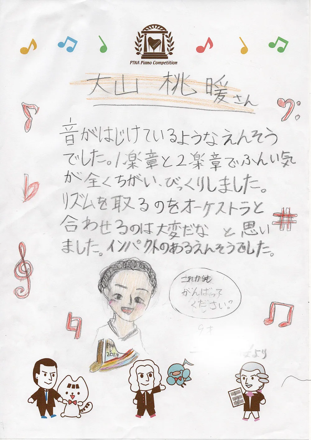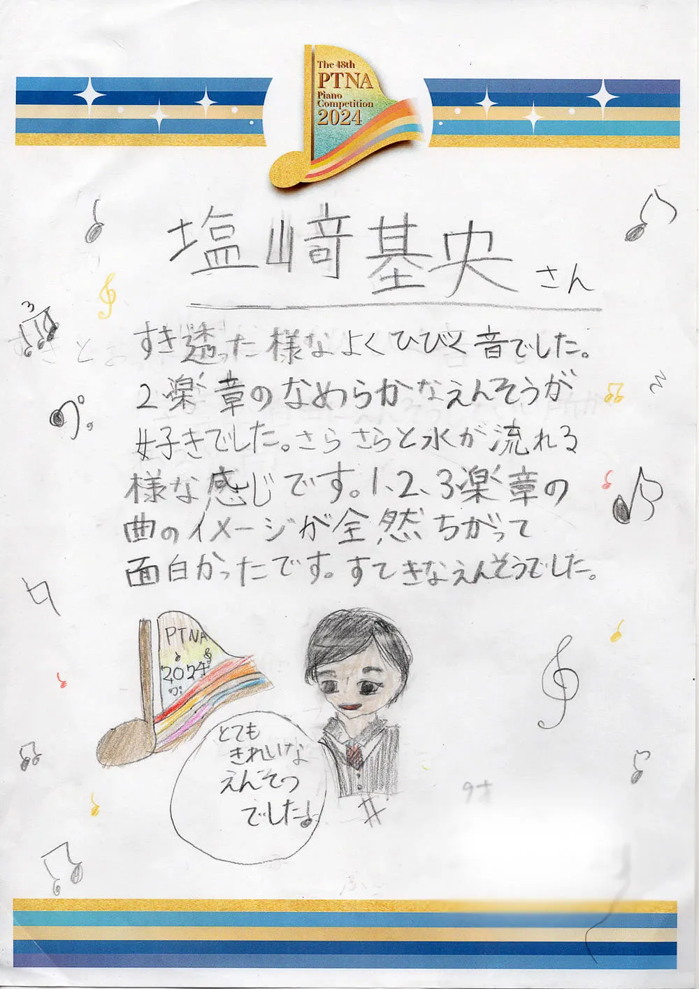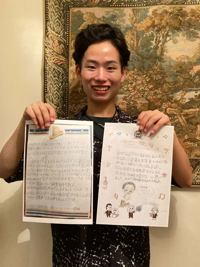 この度は、演奏を聴いてくれたキッズたちが心のこもった応援のお手紙や似顔絵を書いてくれて、とても嬉しくほっこりなりました。お手紙を書いてくれた子供達が将来、特級の舞台を夢みて挑戦してくれたり、日常の一部として音楽を楽しみながら過ごしてくれたら嬉しいなと思います。子供時代は一瞬なので、色々なことにチャレンジして全力で楽しみ、たくさんの事を経験して心の豊かな人に成長していってほしいです。僕も何事も楽しく全力でチャレンジしていきます!応援してくださった全ての方々に感謝申し上げます。ありがとうございました。