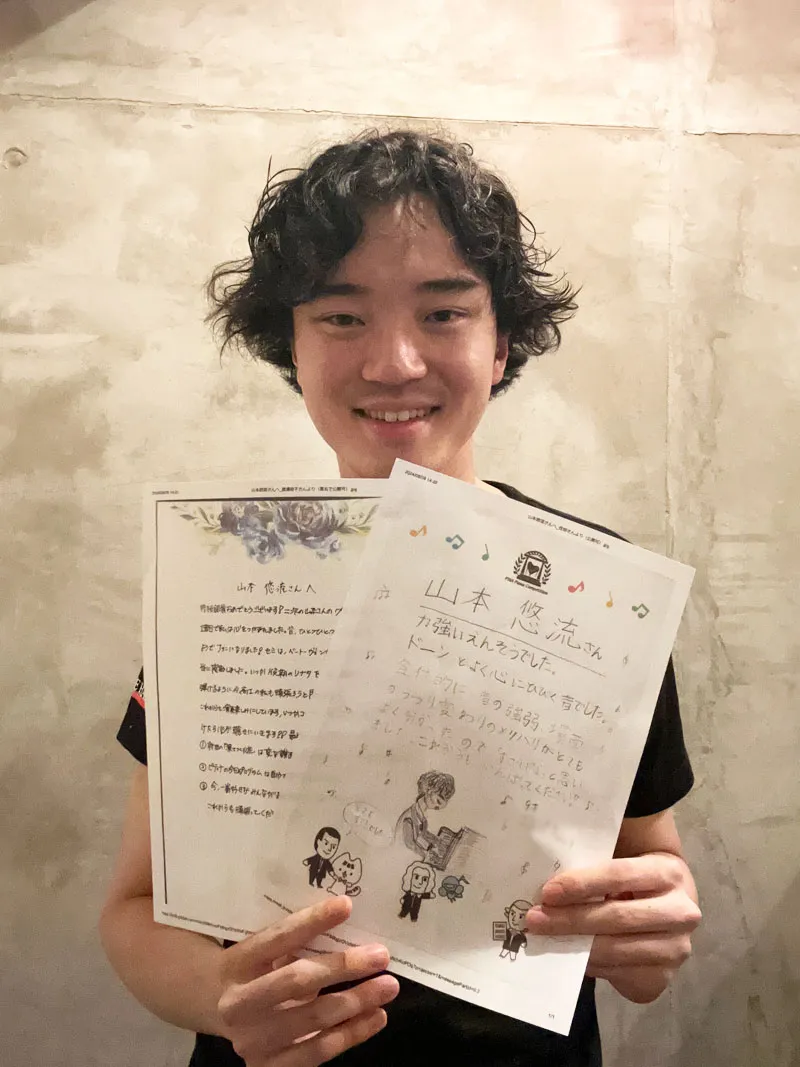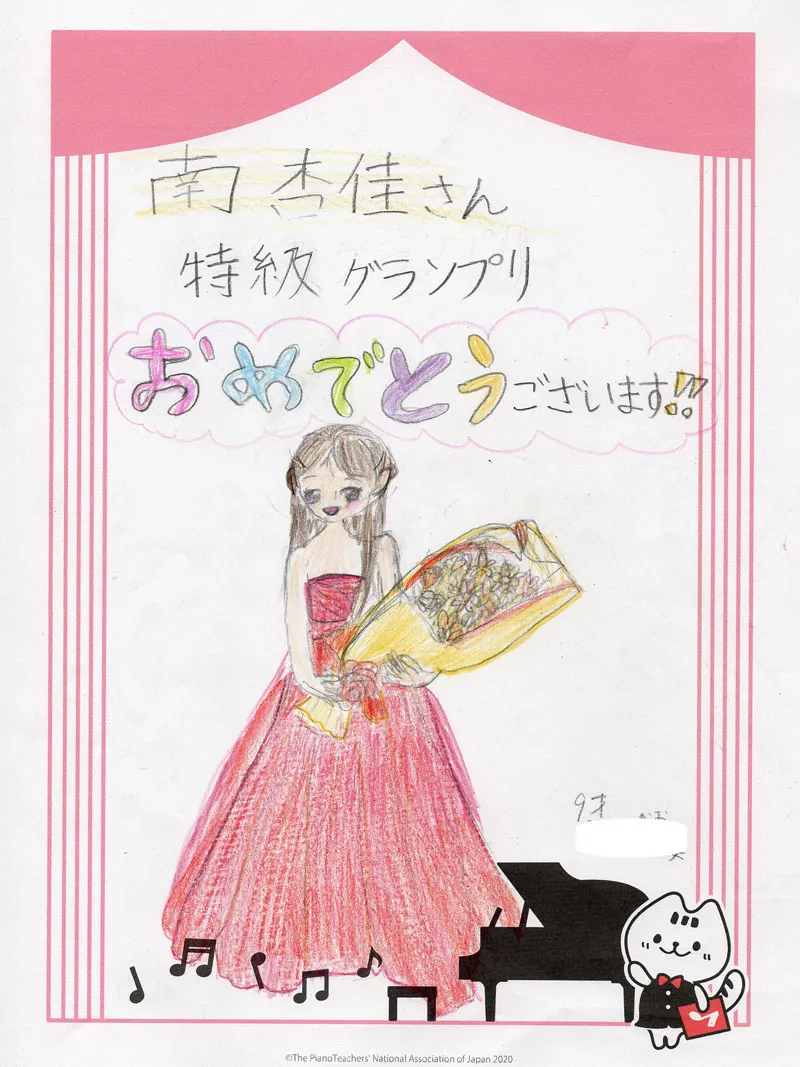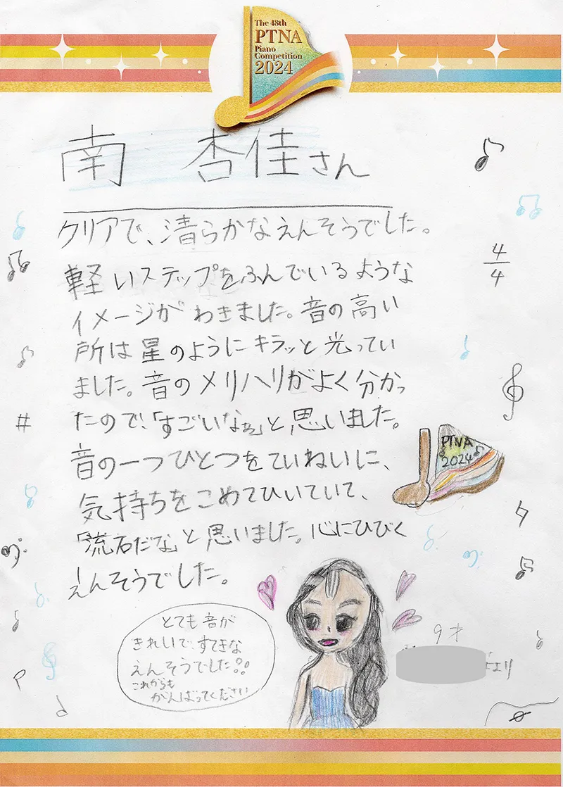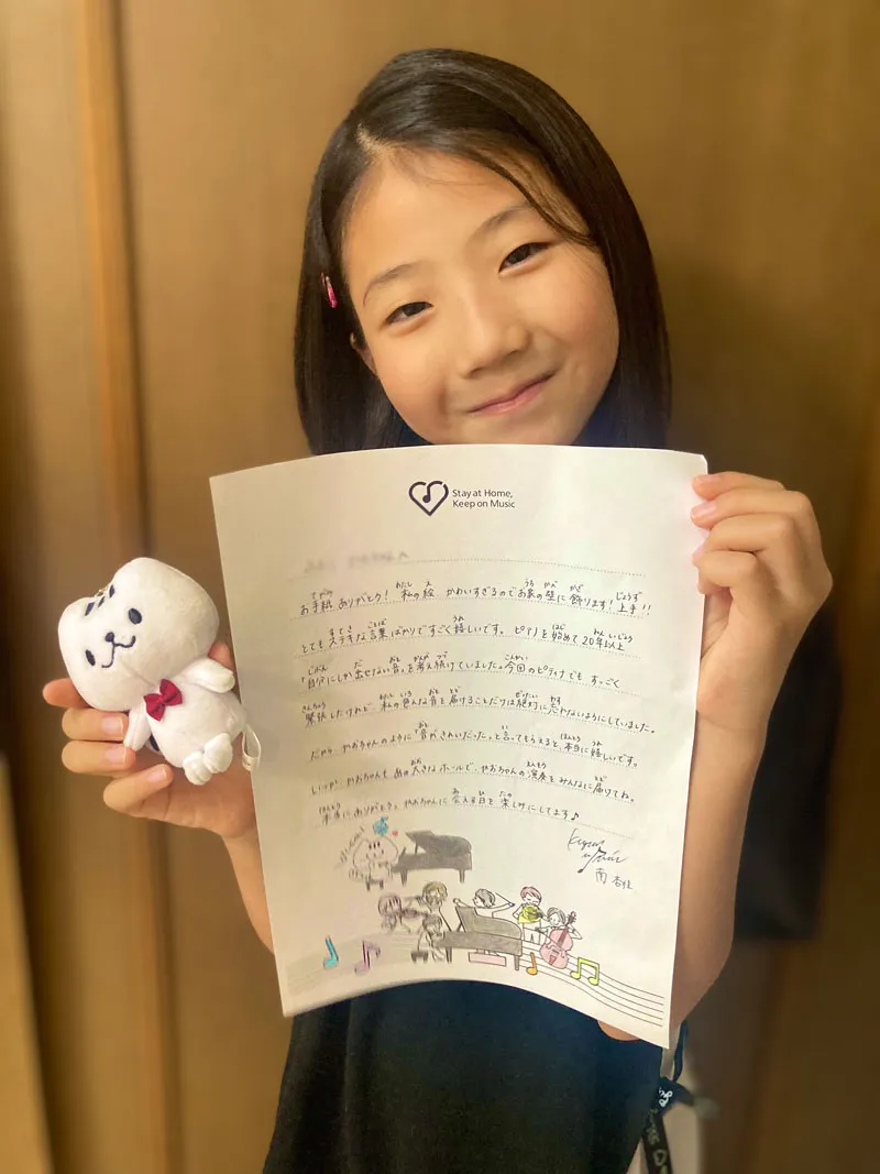 この度は、演奏を聴いてくれたキッズたちが心のこもった応援のお手紙や似顔絵を書いてくれて、とても嬉しくほっこりなりました。お手紙を書いてくれた子供達が将来、特級の舞台を夢みて挑戦してくれたり、日常の一部として音楽を楽しみながら過ごしてくれたら嬉しいなと思います。子供時代は一瞬なので、色々なことにチャレンジして全力で楽しみ、たくさんの事を経験して心の豊かな人に成長していってほしいです。僕も何事も楽しく全力でチャレンジしていきます!応援してくださった全ての方々に感謝申し上げます。ありがとうございました。