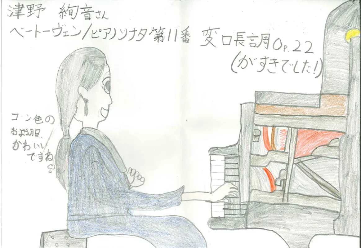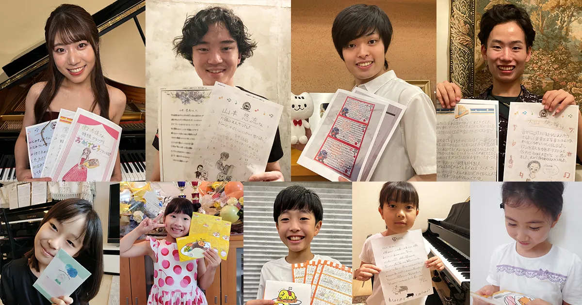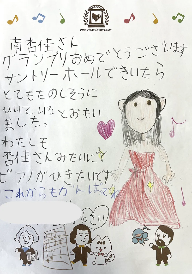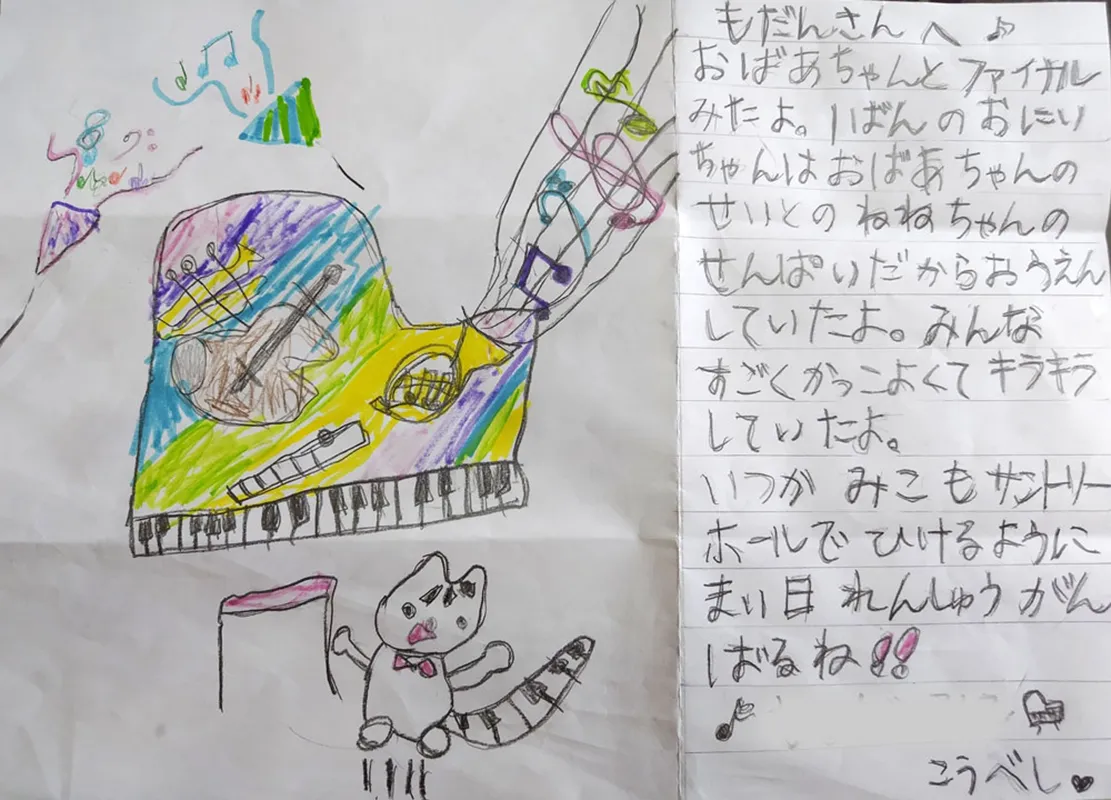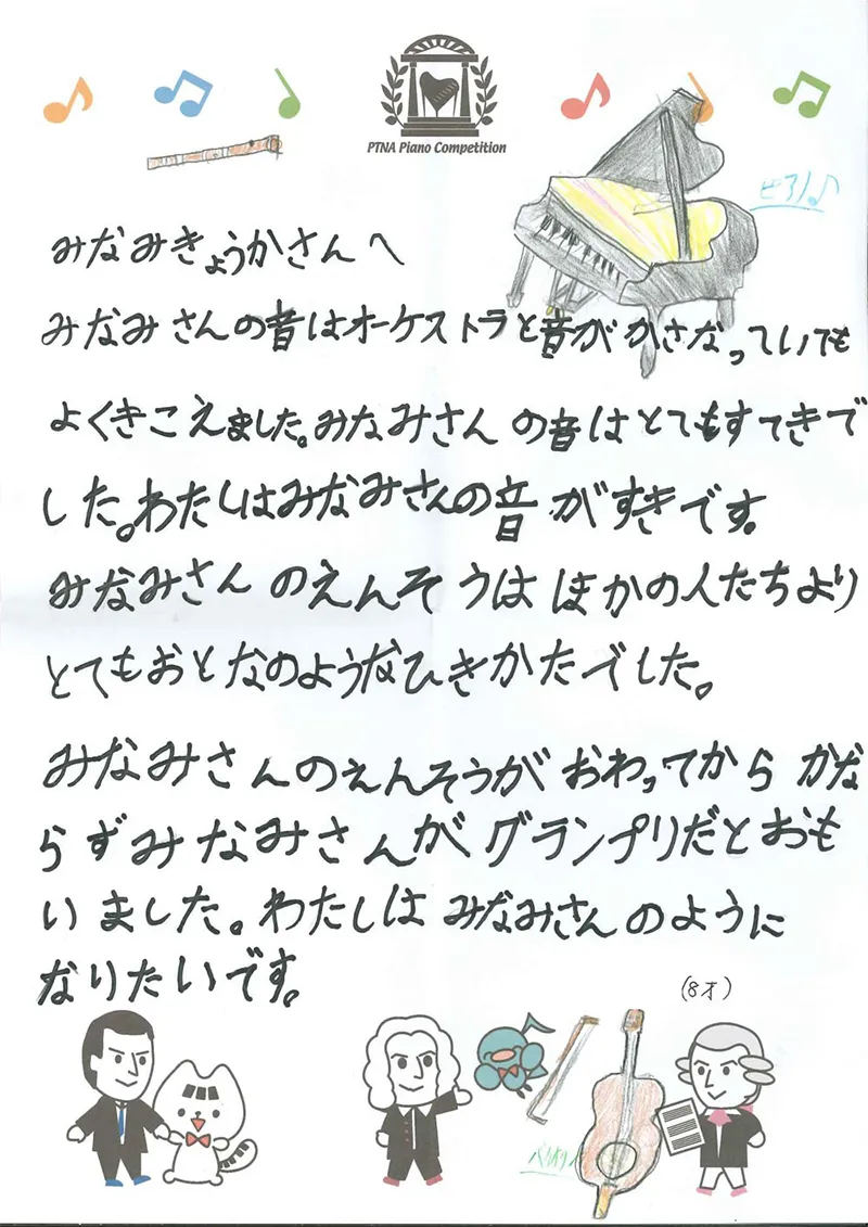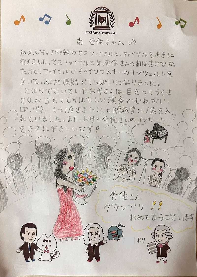 ピティナ特級の舞台では一次予選からファイナルまで多くの方に演奏を聴いていただき、本当に幸せな時間を過ごすことができました。また、お手紙までいただき、イラストを描いてくださった方々もいて大変励みになりました。私も小学生の頃からピティナのコンペを受けていてその頃から特級はいつか出てみたい憧れの場所だったので、小学生からの手紙を読んでいて、とても懐かしく感慨深い気持ちになりました。こうした企画を通じて、子供たちが大きな舞台に挑戦するきっかけになればとても嬉しいです。