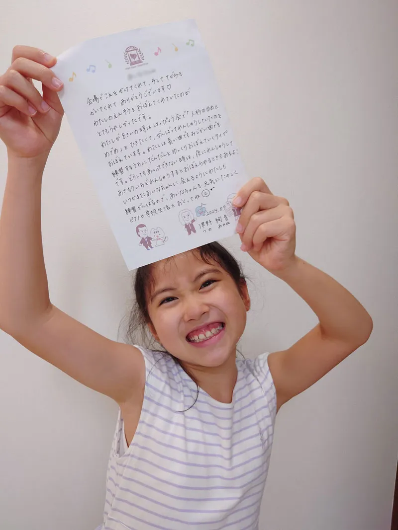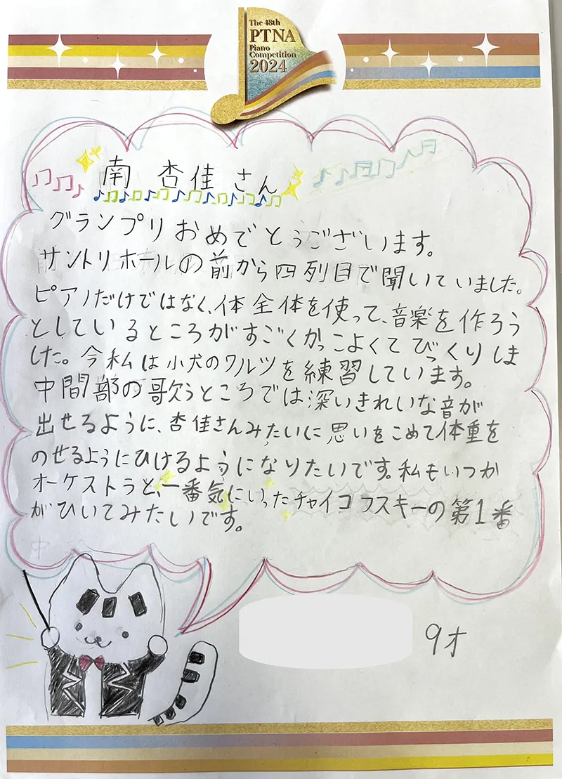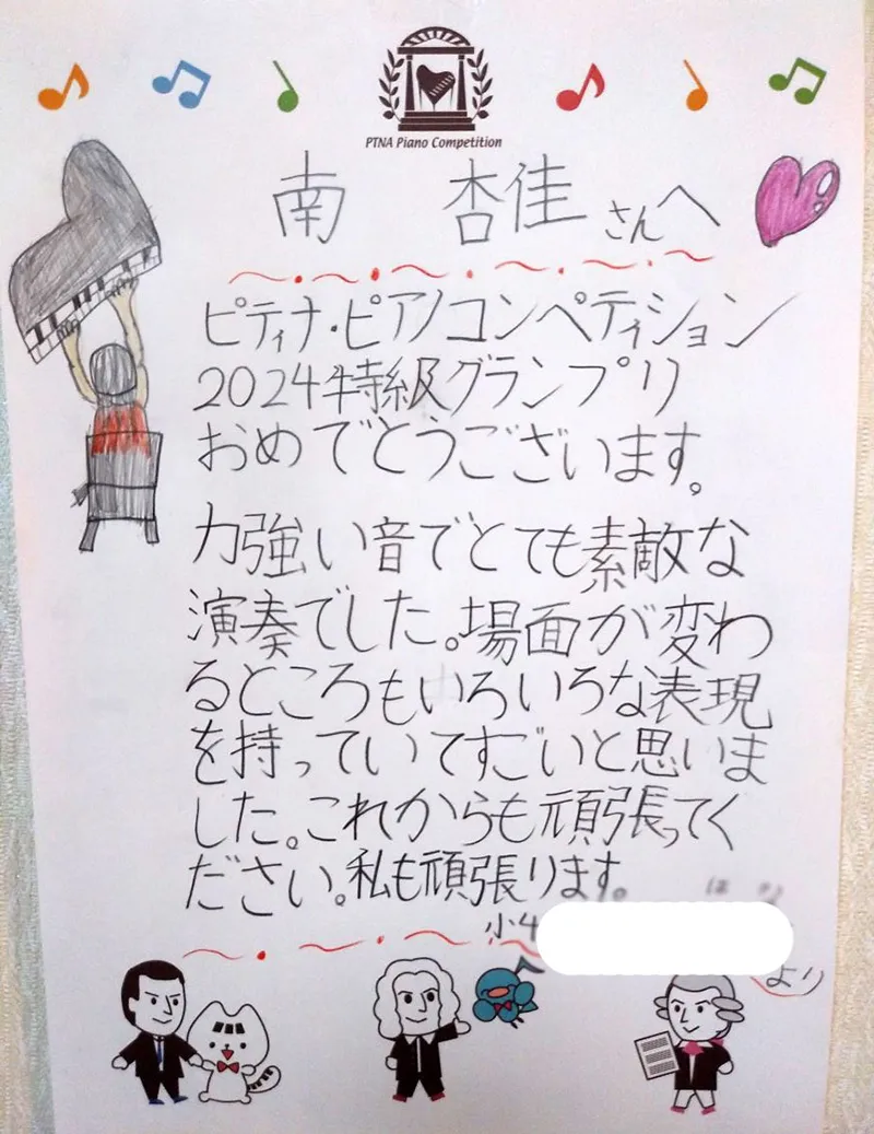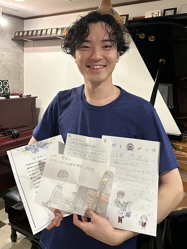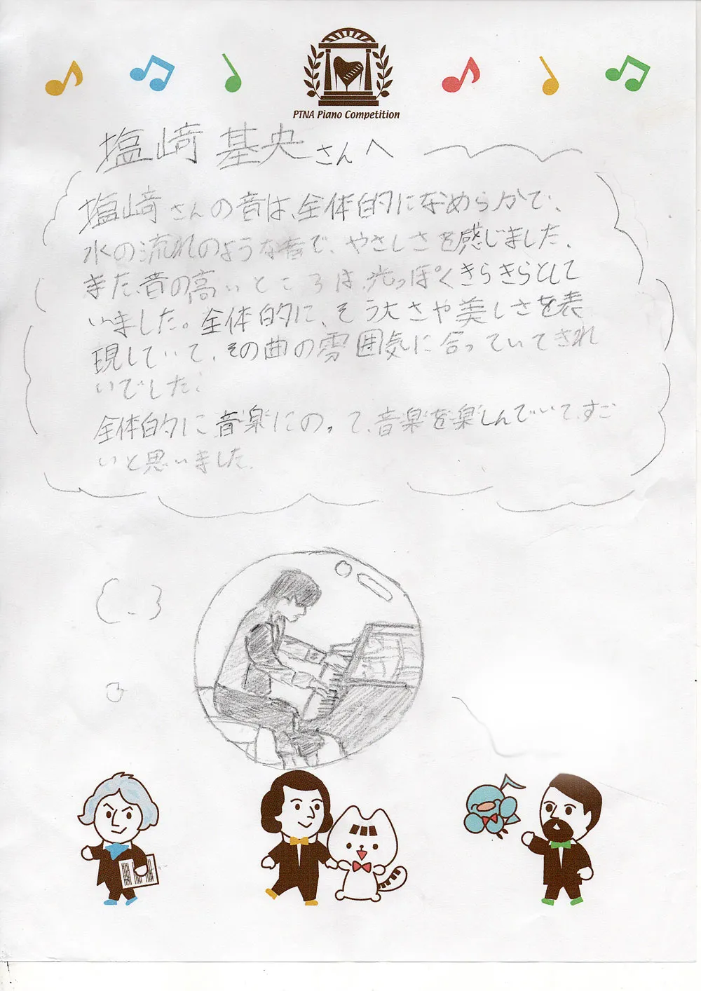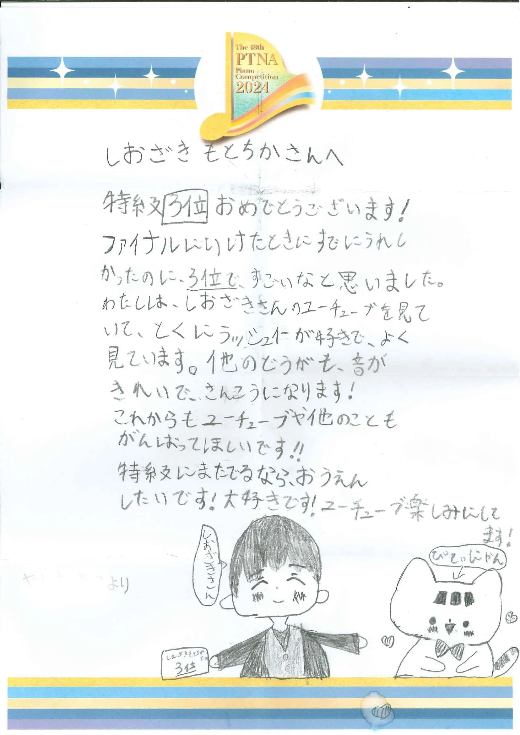 ピティナ特級の舞台では一次予選からファイナルまで多くの方に演奏を聴いていただき、本当に幸せな時間を過ごすことができました。また、お手紙までいただき、イラストを描いてくださった方々もいて大変励みになりました。私も小学生の頃からピティナのコンペを受けていてその頃から特級はいつか出てみたい憧れの場所だったので、小学生からの手紙を読んでいて、とても懐かしく感慨深い気持ちになりました。こうした企画を通じて、子供たちが大きな舞台に挑戦するきっかけになればとても嬉しいです。