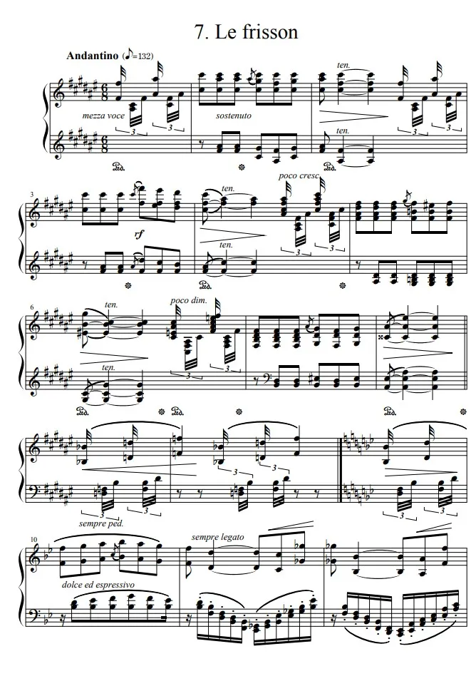 演奏上の注意としては、とにかく出だしは美しく。32分の3連符は決してうるさくなってはいけません。後半の「戦慄」する箇所も、あくまで控え目に、 mezza voce を忘れずに。阿鼻叫喚ではなくて、静かに肌が粟立つ感覚です。最後のアルペッジョ部分は弾きやすい指遣いをきちんと決めて、素早く、かつ音の粒が立つように気をつけましょう。あと、このアルペッジョの音型、実は出だしの音型と同じだということも意識の片隅にとどめておきましょう。