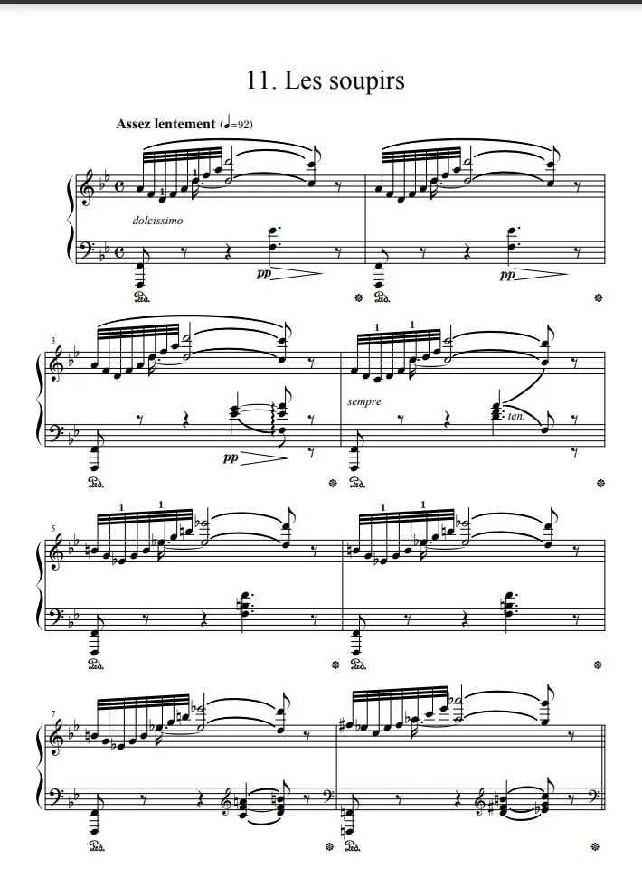 アルペッジョはかなり素早い指の返しが要求されますが、淡い色調を崩さないように注意しなければいけません。ペダルをかけているので、指でつなげることよりは音の粒を柔らかくそろえることに意識を集中して弾きましょう。最終的には、ひとつひとつの音が溶け合って、繰り返されるモチーフの各々が、ため息の1回1回を表したひとつの音響効果として聞こえる......くらいのつもりになれると良いと思います。