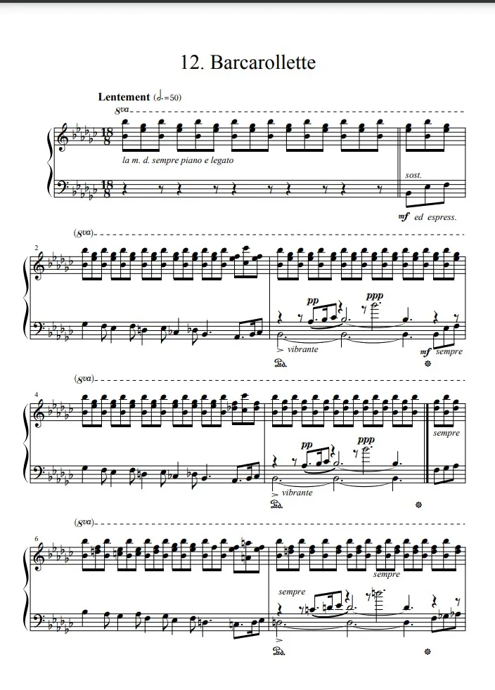 それでは「小舟歌」という曲自体について触れておきましょう。曲集の〆に「舟歌」を持ってくる、というのはメンデルスゾーンの『無言歌集』に感化されたものだろうか。いずれにせよアルカンが「舟歌」に特別な感覚を抱いていたことは確かで、たとえば『歌曲集』と名づけられた5つの小曲集はすべて、終曲が舟歌になっています。「小舟歌」がこの位置に置かれているのも、ここまでの12曲でひとつの区切りにしようという意思の表れでしょう。それは曲の終わりに記された "Fin du 1er livre." の文字からもはっきり読み取ることができる。