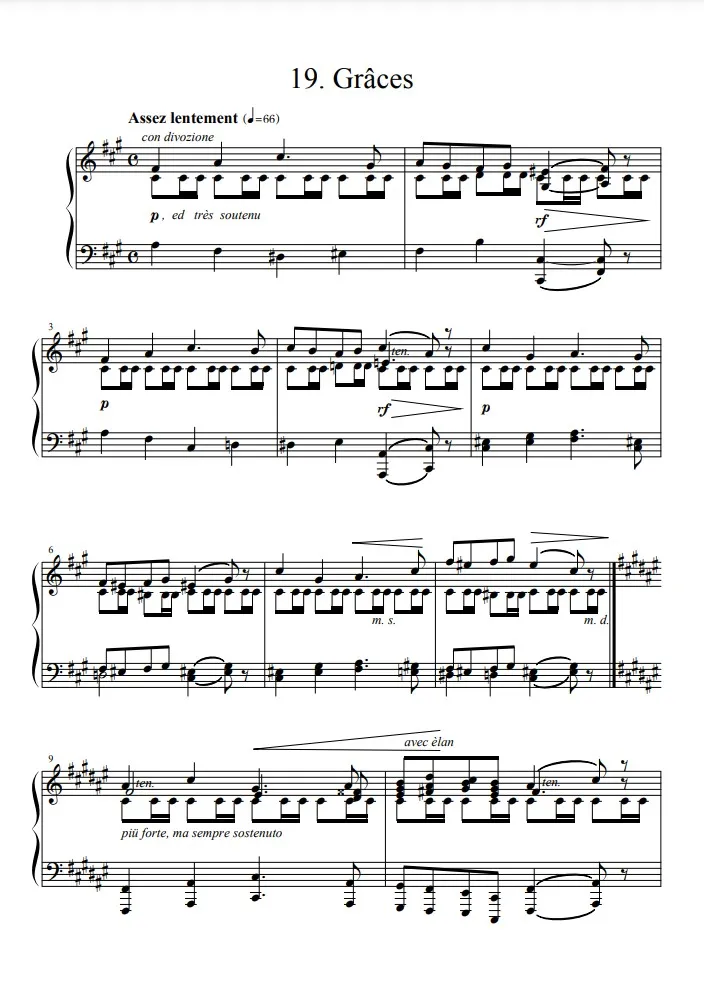 というわけで今回は「恩寵」という曲です。嬰ハ音の連続はうるさくならず、粒をそろえて。右手の腕の重みは常に旋律の側にかかるようにすべきで、それに対して嬰ハ音を弾く親指はやわらかく、コントロール可能な状態で保たねばなりません。中間部の長調は聴かせどころなので、よく歌いましょう。