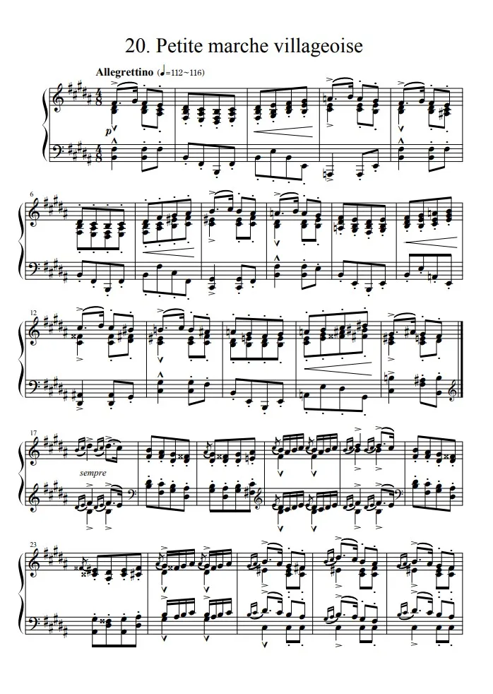 演奏上の注意点としては、まず和音をよくつかむこと。気持ちの良いスタッカートを表現するためにも、内声までしっかり意識して、ひとつひとつ引掻くようにして鳴らしましょう。リズムはとにかくノリよく、テンポをくずさずに。後半で高音域が加わり、装飾が増える場面では、新たな楽器が合奏に加わる様子を思い描けると良いでしょう。