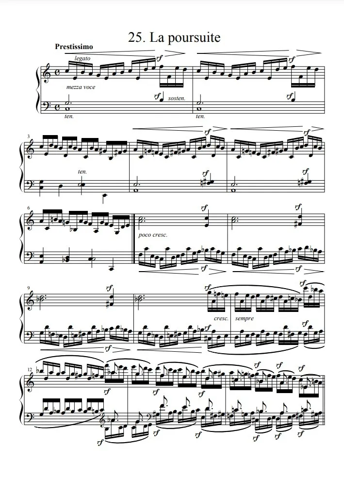 さて、今回の「追跡」、タイトルは「追いかけっこ」の意味にとって問題ないだろうと思います。速いパッセージの練習曲としても捉えられるこの曲、特に3,4,5の指の独立の練習には役立つと思いますので、学習者にもオススメです。肘や手首を柔らかくすることを十分に意識して弾きましょう。ディナーミクはすべて鍵盤にかかる腕の重さを調節して出すような心持で実現できると良いですね。