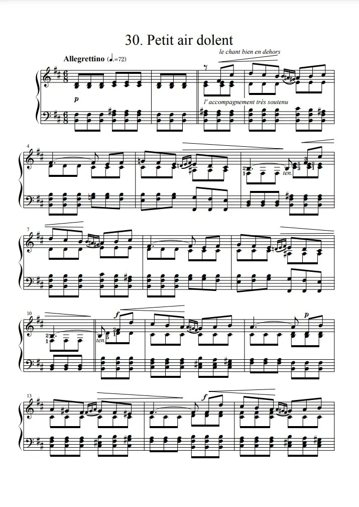 ついでに言うと、「悲しき小さな歌」の終わり方もちょっと特殊です。最後だけ伴奏にスタッカートが表れて、旋律は主音から属音へと5度跳躍の上行形で終わる。これも凡人には書けないものだと思う。悲しい歌なんだから、最後は沈んで行って、旋律は下行しながら主音に落ち着いて終わりたくなる。しかしアルカンはそんな当たり前のことはやらなくて、最後は微妙に浮遊させる。これだけのことで、悲しみが腑に落ちたとか、納得したとか、諦めてちょっと前を向いたとか、そんなごく微妙な心境が伝わってくるマジック!