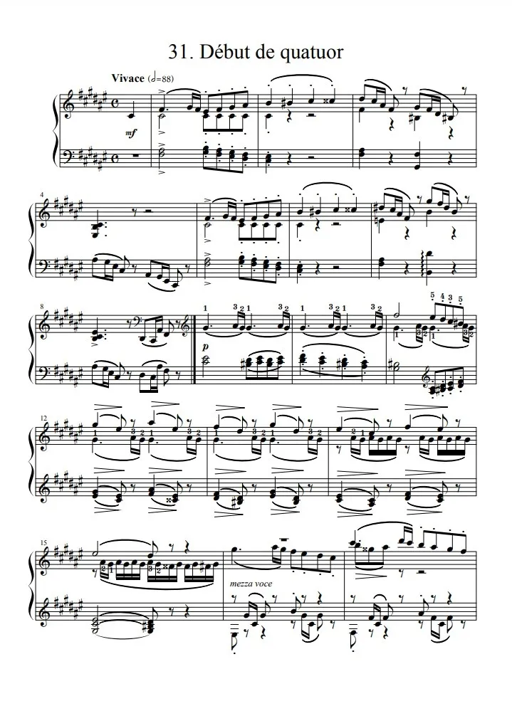 『エスキス』第31曲は「四重奏の冒頭」ということで、タイトルの通り弦楽四重奏を模したものとなっている。古典派のカルテットの明朗な響きがそのまま聞こえてくるような見事な模倣だと思うのですが、ふと素朴な疑問もわきます。