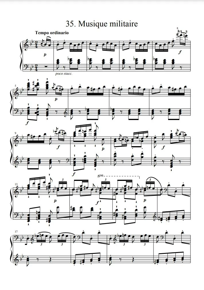 不出来な演奏を揶揄した作品とはいえ、ピアノ演奏自体は、もちろんしっかり歯切れ良くパリッと弾きこなすことが必要です。合奏をピアノ独奏で再現しているわけで、リストやラヴェル寄りの技巧的な書法も出てきます。分厚い和音の連続なども多いので、それらを掴むときの指のバネをよく意識すること。練習曲として弾きこなし、その上で「滑稽」さが演出できれば言うことなしです。音楽の流れや横のつながりより、唐突さや縦のリズムを強調してみましょう。