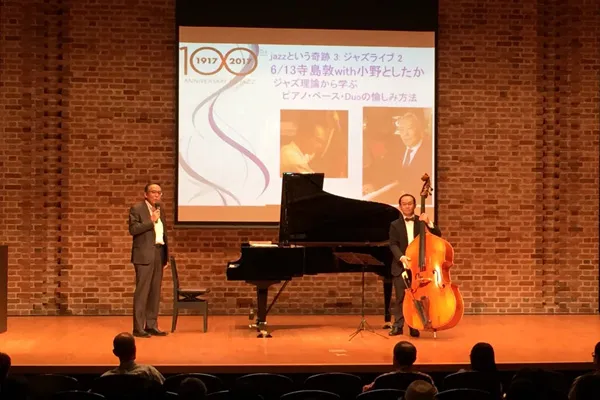 (於:西南クロスプラザホール)にて、演奏とジャズ理論の解説を行う寺島さん。