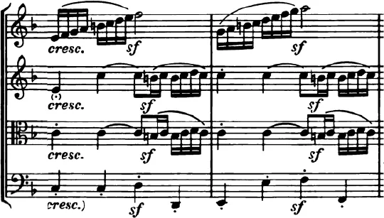 この部分では第一に、第2ヴァイオリンとヴィオラの小節後半に刺繍音とターン音形の動機が加えられ、ちょうど内声が第1ヴァイオリンの上行音階に応える形になっています。それも新たに作られた声部同士の掛け合いの一つなのですが、ここでもう一つ注目したいのはスフォルツァンドのアクセントです。ベートーヴェンはオリジナルにはなかったスフォルツァンドを小節後半に書き加えていますが、全パート同時ではなく、外声と内声でタイミングを微妙にずらしています。