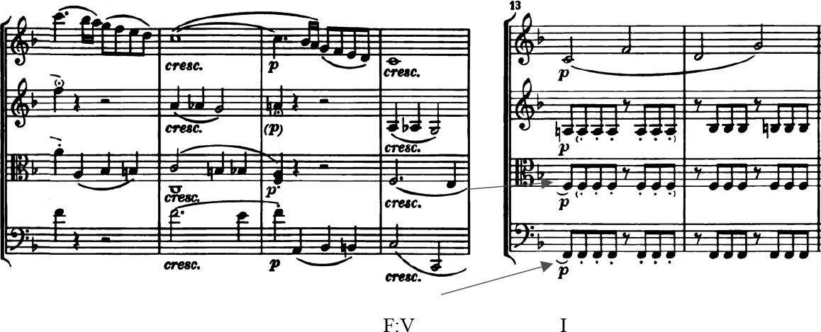 和声的に見ると、第12小節の終止カデンツのドミナントは第13小節の冒頭で解決します。形式的に見ますと、第12小節は4小節の長さの楽句の最終小節になり、第13小節から新しい楽句が始まります。すなわちこの部分はちょうど和声的・形式的な区切りの部分に当たるのです。それでは編曲を一つ前の第12小節目から見ますと、第13小節目の拍頭に8分音符が書き加えられた結果、ヴィオラに第12-13小節に導音進行(「ホ−へ」の2度上行)が作られ、同じ場所でチェロも四度上行という典型的な終止カデンツ進行をしています。解決音に向かっての導音進行と四度上行は、どちらも和声的な牽引力の強い進行です。