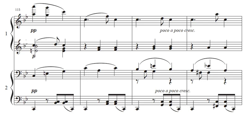 このように低音域を重ねることで音響の広がりを効果的に実現するところもあれば、低音のオクターヴを重ねてもいいように思われるところで、低音域は狭く抑えられている箇所もあります。 譜例4 第1楽章 提示部第115小節~ 弦楽六重奏曲