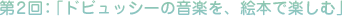 親御さんが子どもと一緒にCDを聞いている時、かつて自分が幼少時代に聞いたシャンソンの一節が出てくると、『あ、これはあのフレーズ!』というように気づくのですね。そういう意味で、『おもちゃ箱』は様々な音楽のレファレンス、としても面白いと思います。」子どもだけでなく、大人の共感と関心を呼ぶツカミも、ドビュッシーは意識していたのである。まさに、家族で楽しめる音楽絵本なのだ。