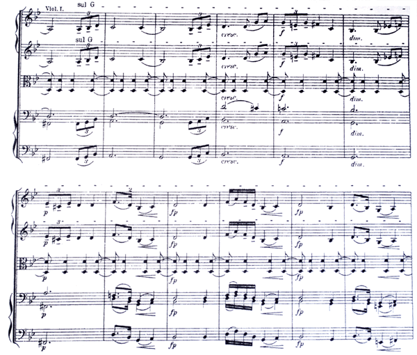 次はグリーグの交響曲『ペール・ギュント』組曲第2番「イングリッドの嘆き」。冒頭allegro furioso(2/4拍子)の後、andante doloroso(3/4拍子)から8分音符の三連符が使われています。まず全員で視唱した後、各々の専攻楽器で合奏しました。