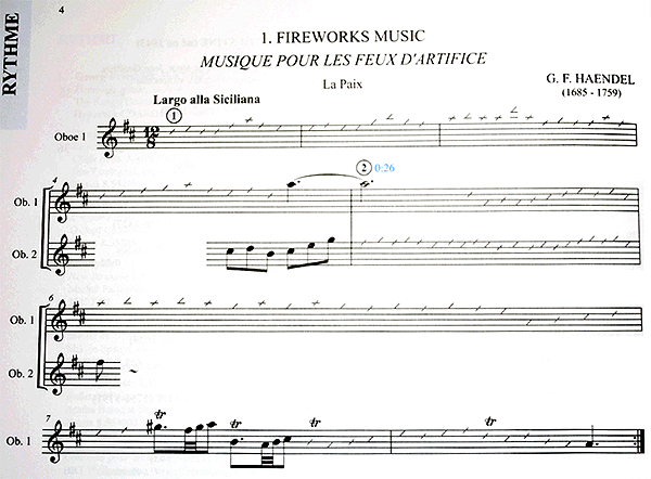 まず宿題の答えあわせから。ヘンデル 『王宮の花火の音楽』より「平和」のCDを聴きながら、予め主旋律(オーボエ)の音程が示されてある譜面に、正しいリズムを書き込む課題です。この曲は8分の12拍子で、冒頭に登場するシシリエンヌのリズムが特徴。シシリエンヌはルネサンス末期からバロック初期に生まれた舞曲で、バッハやヘンデル、ボッケリーニなどがその形式やリズムを用いて作曲しています。フォーレ『シシリエンヌ』が一般には有名ですが、本来は古典楽曲で多用されています。この曲もその一つ。