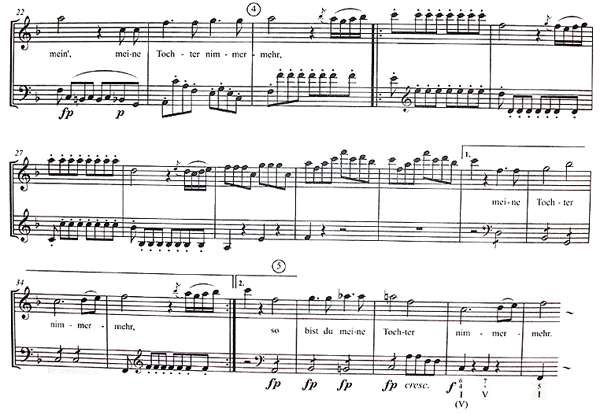 先生「では次に音程を取りましょう。7~10小節(ミ♭ファ♯ファ♯ソラシ♭ ソミレド♯)まずは歌ってみましょう」 先生「ミ♭ファ♯(7小節1~3拍目)の音程は?」 生徒「う~ん、増二度」 先生「ミ♭レド♯(9小節3拍目~10小節1拍目)のカデンツは?」 生徒「半終止かな」 先生「では11~14小節(ファラドファ ドラソファミレドシ♭ラ シ♭ソ)」で、14小節1-2拍目の音程は?」 生徒「シ♭ソは長六度。だから、その転回音程(renversement)は短三度」 先生「14~16小節(ソシ♭ラソファミレドシ ラファ)で、16小節1-2泊目の音程は?」 生徒「・・短六度!」 先生「その転回音程は?」 生徒「長三度!」その他にも「増六度を転回すると?」「減三度!」、「じゃあ減七度の反対は?」「増二度」といったように、六度、七度の音程に慣れさせる演習が続きます。音程を取る演習は下級生クラス(第2課程1年目)でも行われていますが、この上級生クラスでは転回音程と、実際の楽曲を使っているのが特徴です。