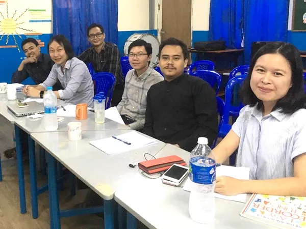 審査員たち。テーブル一番奥がモエ・ナイン氏(ピアノ)、中央がソウ・モーゼス氏(音楽教育)、一番手間がナウ・キーン・ミャト・モン氏(フルート)