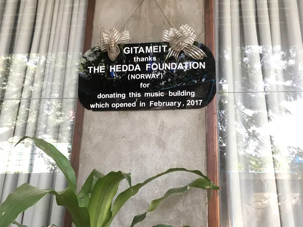 ギタメイト音楽センターのエントランスと新しい校舎に掲げられているプレート。ノルウエーの財団からの寄付により建てられたと記されている。