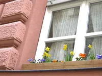 最後に店主は「レーゲンスブルクは、メトロノームの創作者メルツェル(1772~1838)の故郷でもあるんだよ。彼はこの通り沿い、二つほど先のブロックで生まれたんだ。」とも教えてくれました。出ると、通りの軒先にはかわいらしい花が。頭のなかで「やさしい花」が聞こえてきました。
