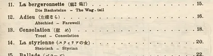 続く頁に後世のそれよりもだいぶ詳しく正確な作曲者紹介があった後、仏・独・英・日訳によるタイトル一覧。特に日本語訳に注目してみると見慣れぬ漢字表記が目に飛び込む。現在ひらがな表記されることの多い「せきれい」は「鶺鴒」。もう二度と会うことはないという気分の漂う「左様なら」の後には「慰め」。また、時代が下ると「子供の集会」や「子供会」と称されるようになる第5曲は「子供の會」、「貴婦人の乗馬」としてよく知られる第25曲は「令孃の馬乗」というように、日本語訳には外来文化を輸入する際に垣間見られるその時代の想像力と歴史的語感とが凝縮され、結果的に当時の日本文化が逆照射される。